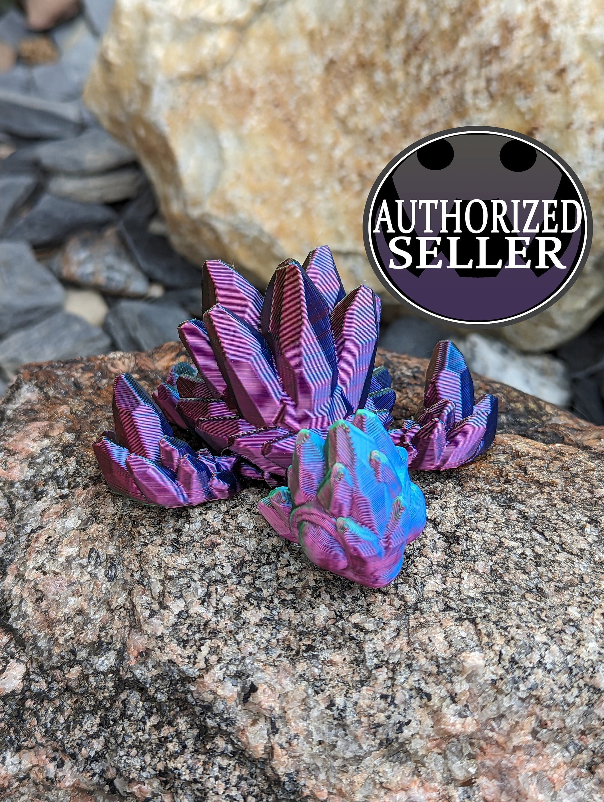 A fully articulated and moveable crystal turtle from the designer Cinderwing3d's collection. It is 3.5 inches long and 4 inches wide. The dual and tri color filaments will look different from each angle and depending on the starting point will vary from item to item.